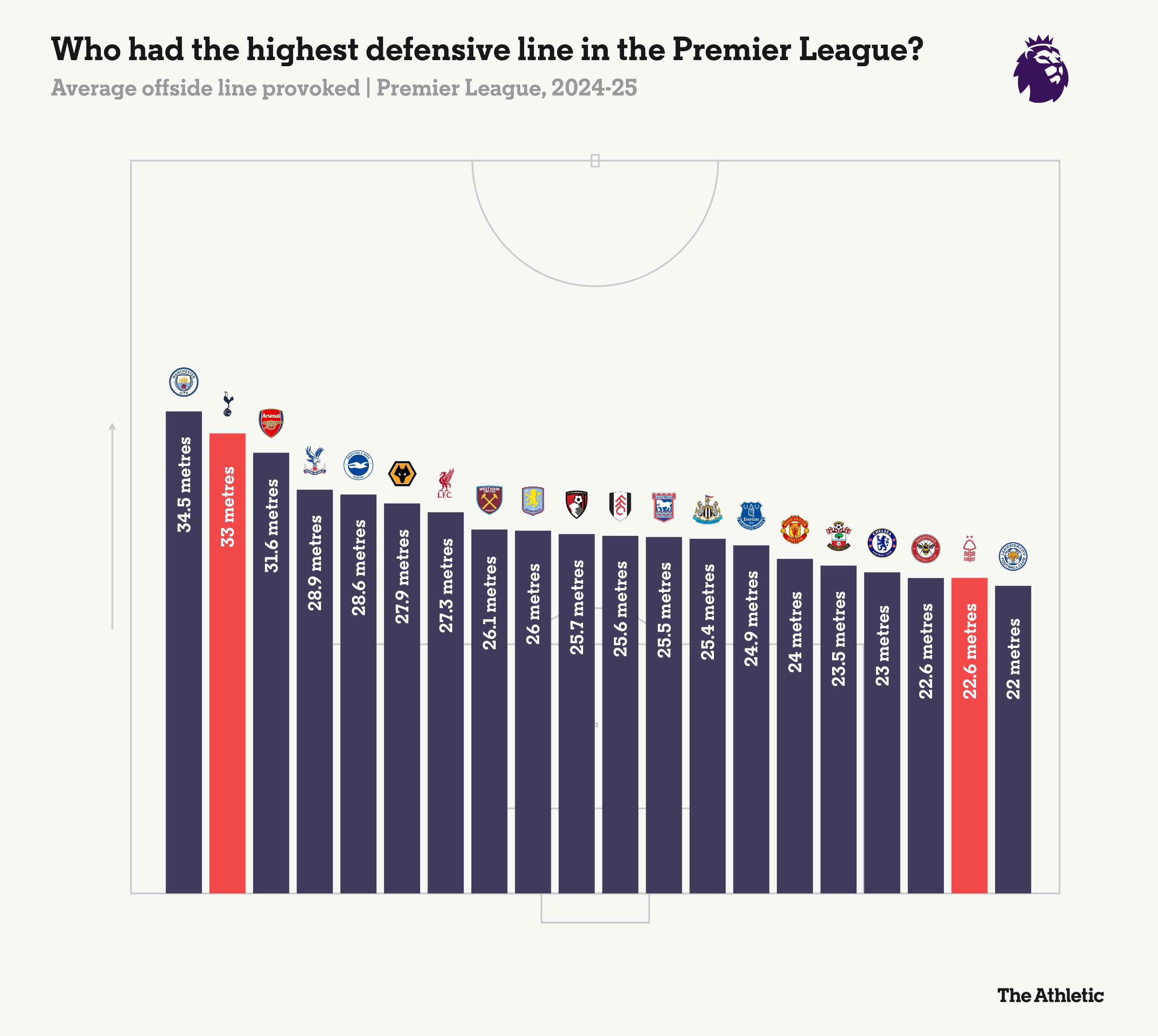 在球场另一端,如果波斯特科格鲁坚持激进的高位防线,森林队的后卫们将迎来一场关于如何防守空间的速成课。由于中卫罗梅罗和范德芬频繁受伤,热刺的防线并未像波斯特科格鲁执教的第一个赛季那样大幅前压,但仍然显著高于森林队的防线。